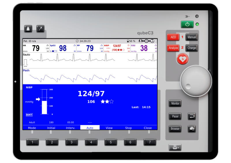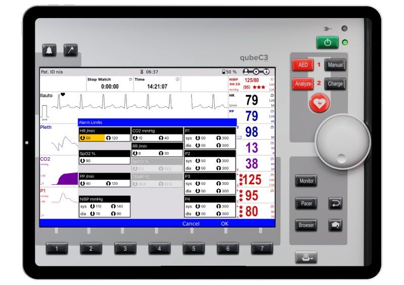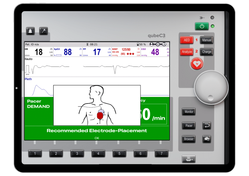 The SKILLQUBE simulation system qubeC3 based on C3 includes an ECG monitor with a fully integrated AED, dynamic 12-lead ECG, wireless control unit for instructors and an external skill trainer for auscultation, blood glucose and temperature measurement.